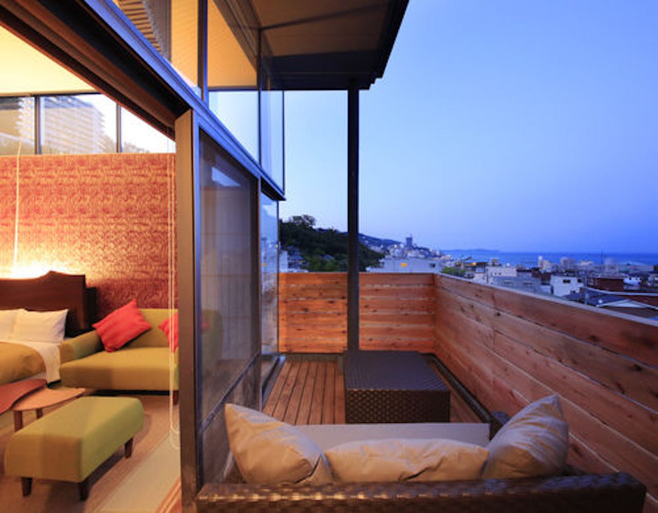 その7絶景掛け流しの宿熱海月右衛門は、近年注目されている旅館で貸切露天風呂が3つもあるのが最大の特徴です。予約が取れれば、家族全員で一つの風呂に入ることができます。旅館名とは異なり、館内はシックな作りになっていますのでゆったりと過ごせるのではないでしょうか。