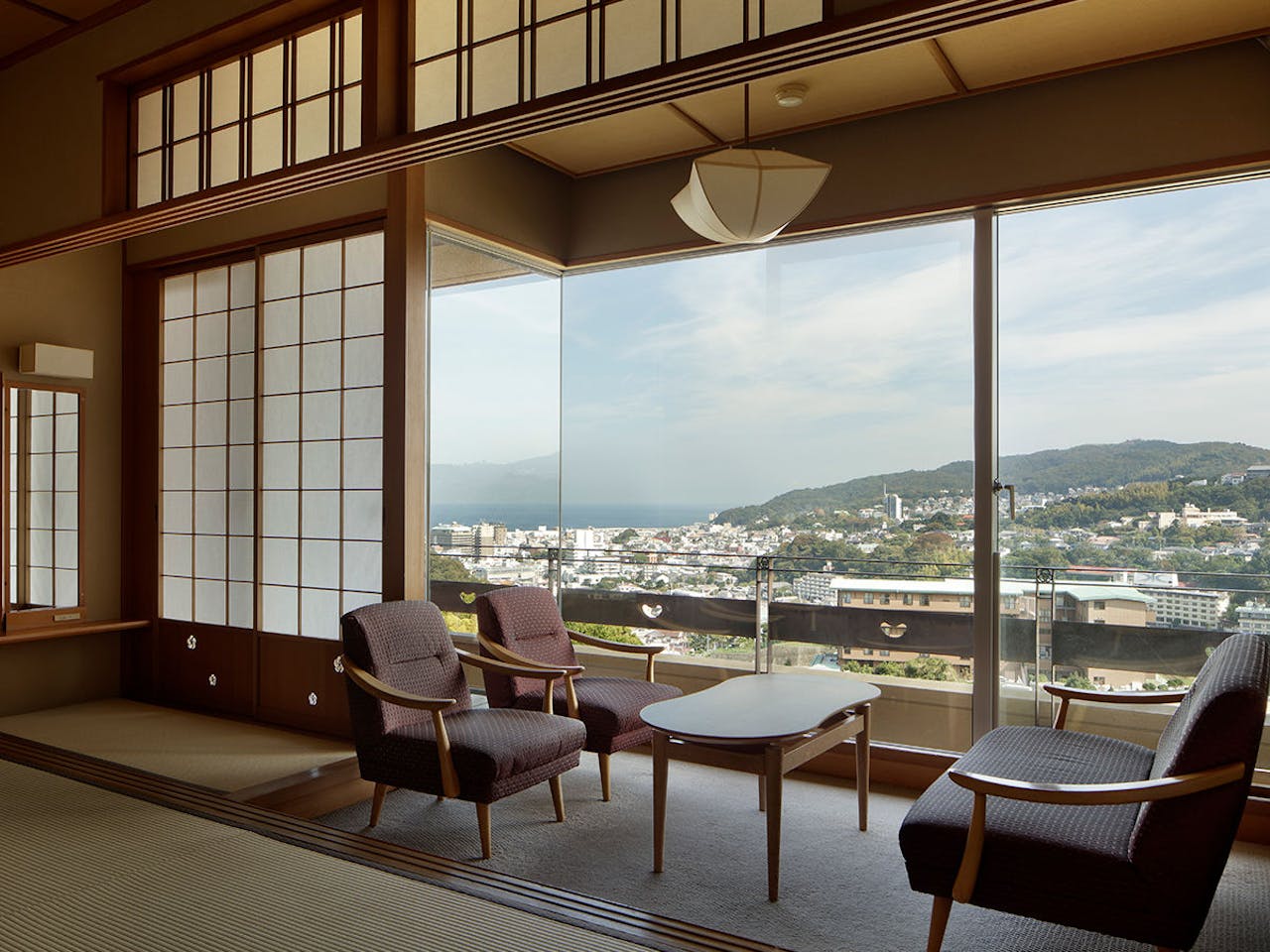 その17つの源泉と60種100品目の海鮮ディナーバイキングが魅力の「伊東ホテル聚楽」は、高台に位置しているため部屋や展望露天風呂から相模湾を一望できます。1歳から3歳の子どもは無料で寝具を貸してもらえる他、お子さまアメニティも付いてきます。希望によってはお子さまランチも提供してもらえるなど、子連れに優しい温泉宿です。