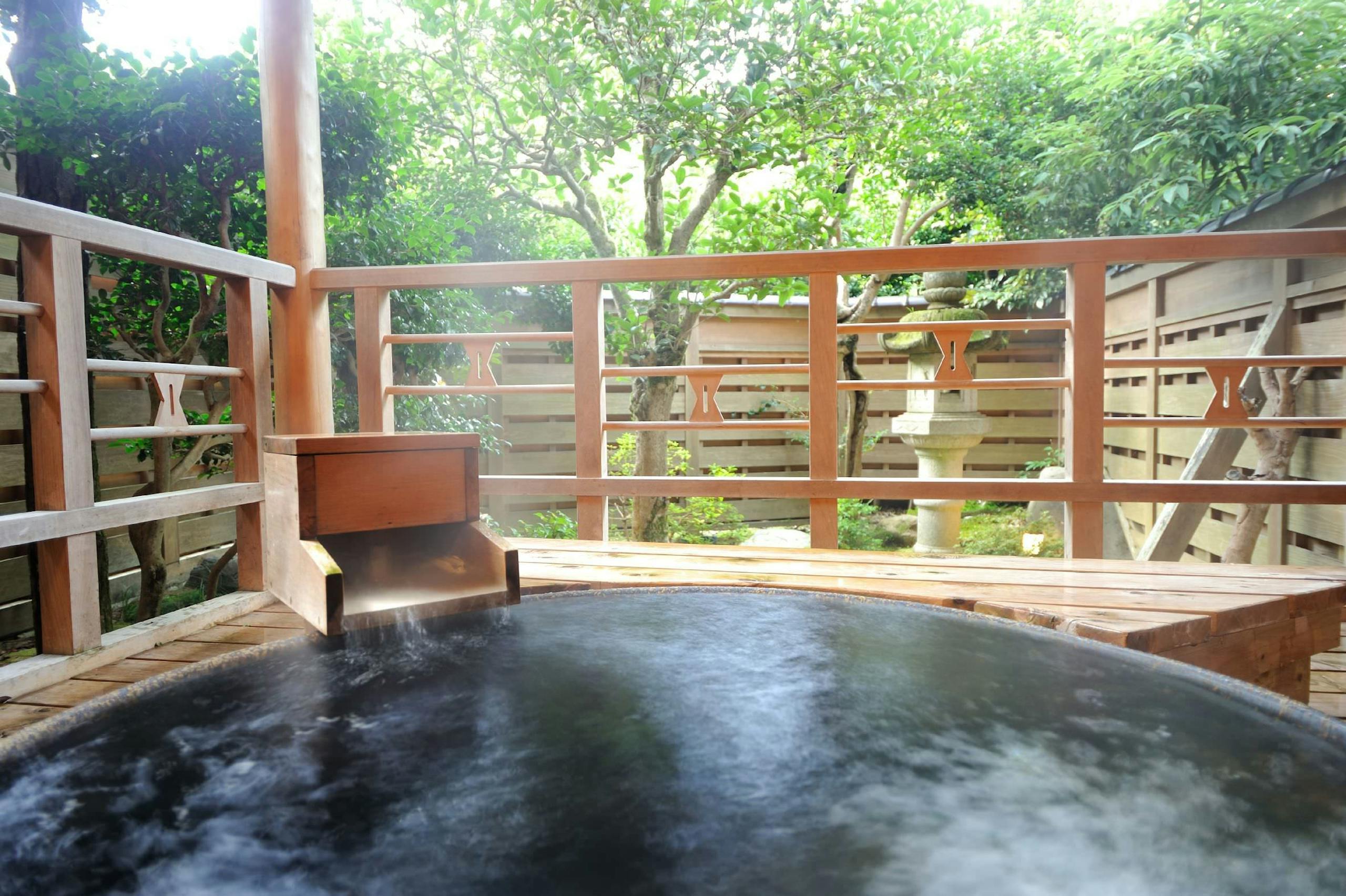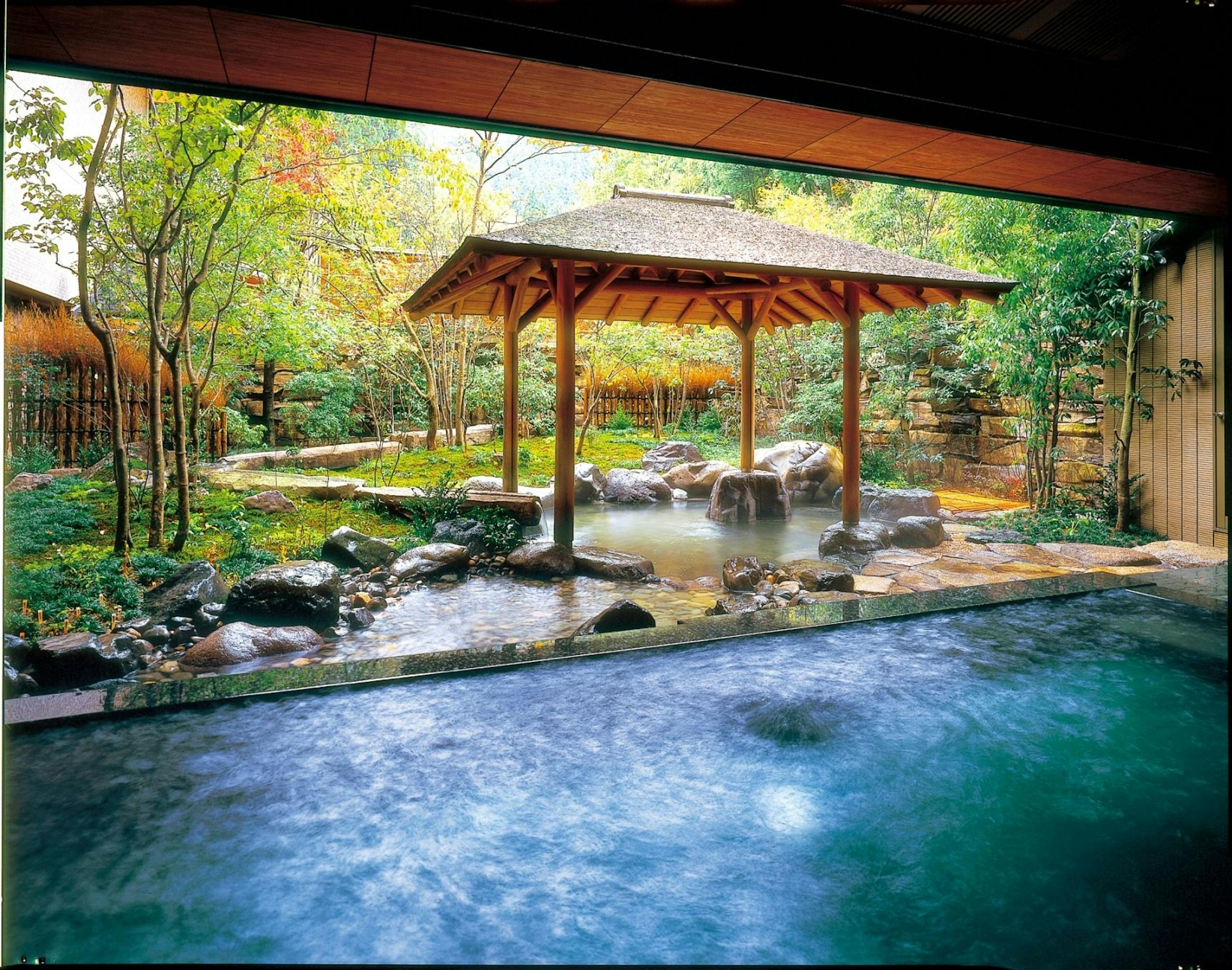 その1は城崎温泉駅から車で10分程の所にある西村屋ホテル招月庭です。5万坪の大庭園の中にあり、庭園内にある森林には四季の花々が咲き、お子さんとの散策や自然観察にぴったりです。夏はプールもあるので水遊びができます。お風呂は男湯女湯だけでなく貸切風呂もあるので、家族で温泉を堪能できます。