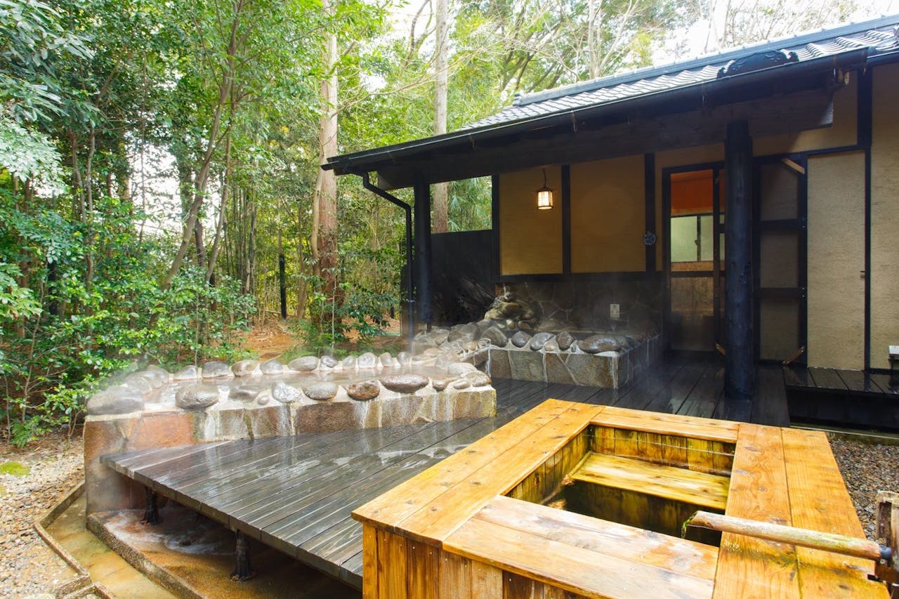その7料亭旅館・竹千代霧島別邸は、霧島山麓に静かにたたずむ全11室の料亭旅館です。東棟・西棟それぞれの1階は、全て露天風呂付きの客室になっています。庭にお風呂があるような雰囲気で、まるで自分の家にいるかのようにのんびりくつろげるのが特徴です。大浴場にはサウナや水風呂もあるので、サウナ好きのパパにもバッチリでしょう。