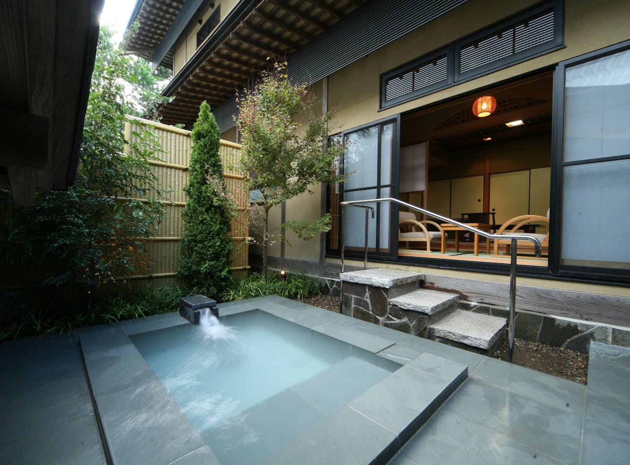 その10Onsen garden 湯本庵・清姫は、全室露天風呂付きの客室という全9室の旅館です。広々と過ごせる和室と洋室の2間続きの平屋タイプと、寝室が2階になっているメゾネットタイプがあり、1室ずつそれぞれに趣きのある造りになっています。部屋付きの専用露天風呂なので、周りに気を遣わずにのんびり過ごせるとファミリーにも高評価です。