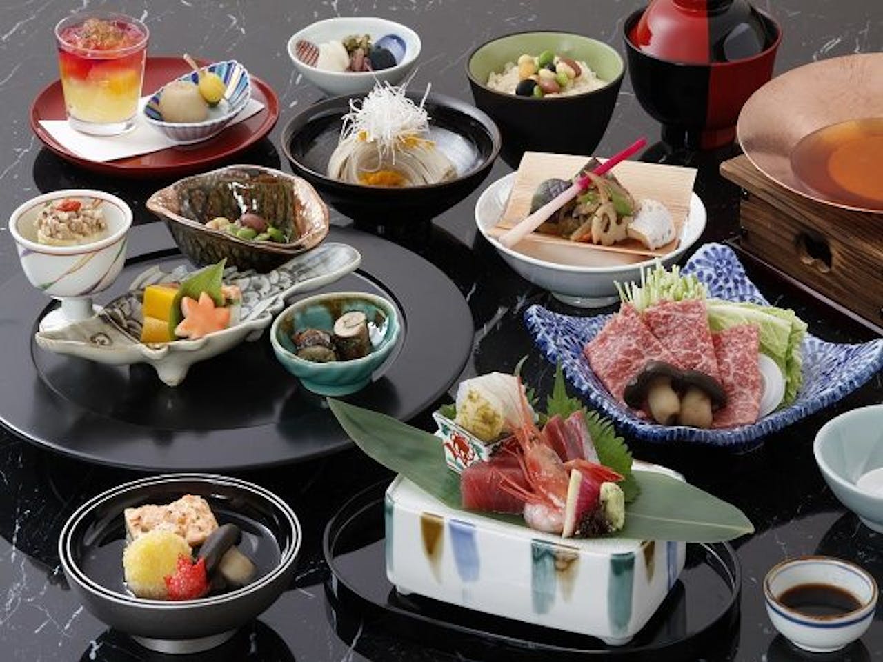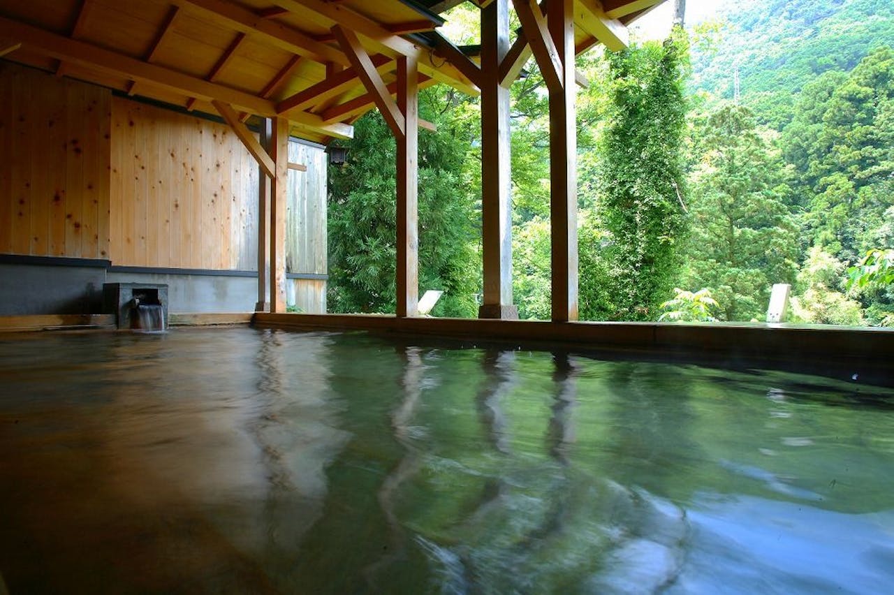 その1緑に囲まれた谷あいの地に佇む「吉祥やまなか」は、渓流を眼下に眺められる上質な建材をいかしたモダンな客室が魅力です。大浴場の他にも3種類の無料貸切風呂があるので、子連れでも周囲を気にすることなく温泉が楽しめます。加賀料理と鉄板焼レストランで旬の地物を味わうことができます。