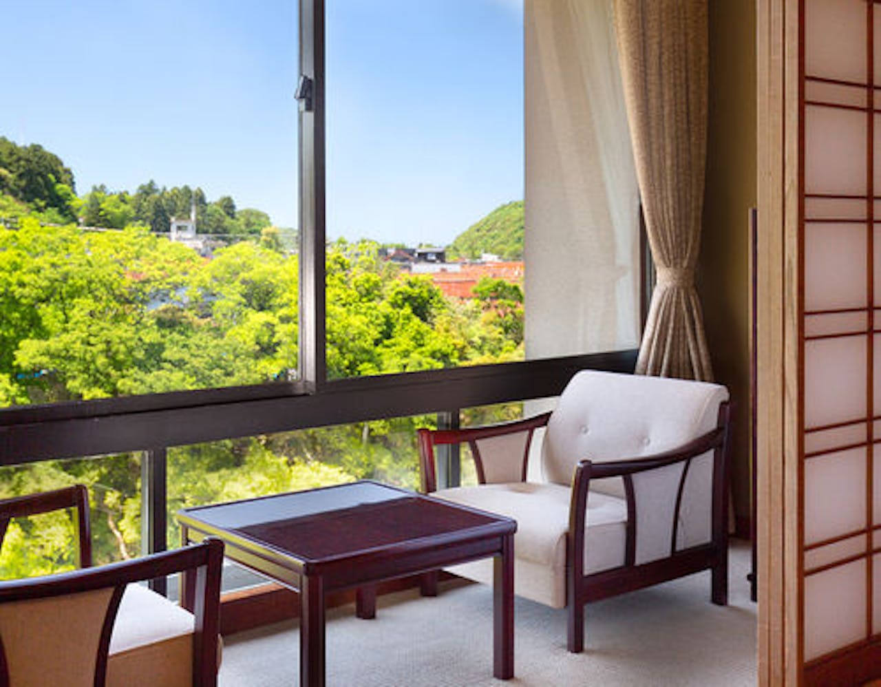 その5山中温泉の景勝・鶴仙渓の中心に位置する「ロイヤルホテル山中温泉河鹿荘」は、檜風呂と露天岩風呂が自慢の温泉宿です。加賀料理といろり焼きから選べる食事は、大人から子どもまで満足できる料理が並びます。子連れでも余裕のある10畳の和室がおすすめです。