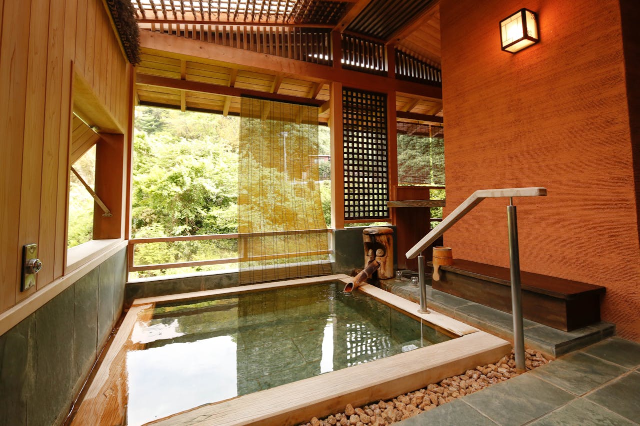 その2万葉の里・白雲荘は、渓流に面した趣の異なる5種類の露天風呂付客室が人気であり、ミシュランガイドに掲載されている高級温泉旅館です。白雲荘は、露店風呂付客室だけでなく貸切風呂もあるので他のお客とバッティングすることが少なく、食事も毎食部屋食なので赤ちゃんや小さなお子さんのいる家庭でものんびりとできます。