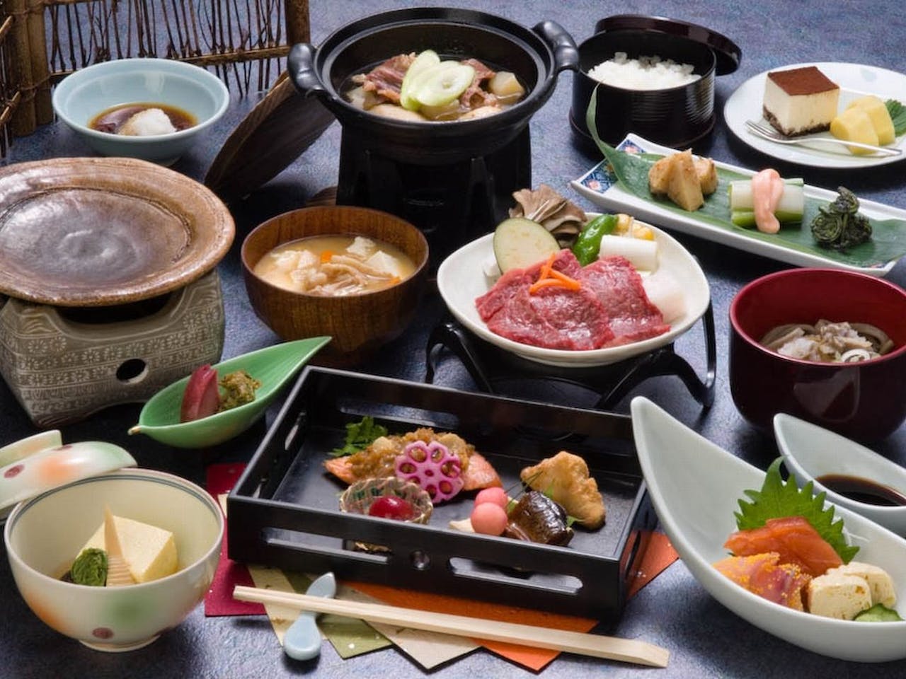 その6名湯舎・創は、温泉街の中央東部の緑豊かな高台にあり、田舎の小学校と山小屋が合体したようなどこか懐かしく癒される温泉旅館です。ファミリープランは、「黒毛和牛すき焼き」と「米の娘ぶたのしゃぶしゃぶ」から選択でき、館内利用券や子供用浴衣などのサービスが付いています。
